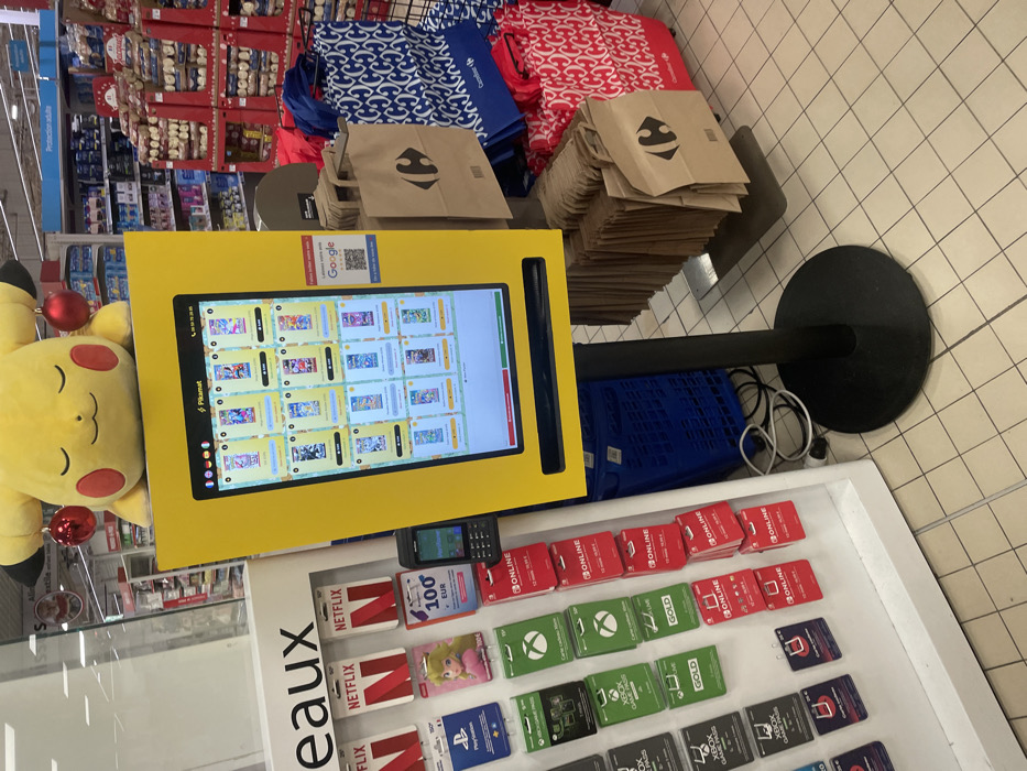 A gift card kiosk at a store displays various gift cards, including Netflix, Nintendo Online, Xbox, and Playstation. Beside the kiosk, a Pikachu plush doll with Christmas ornaments attached is visible. A large stack of shopping bags, both brown and reusable blue and red, are piled up nearby. The store’s shelving system with various products lines the background. The kiosk is in front of a tiled floor.