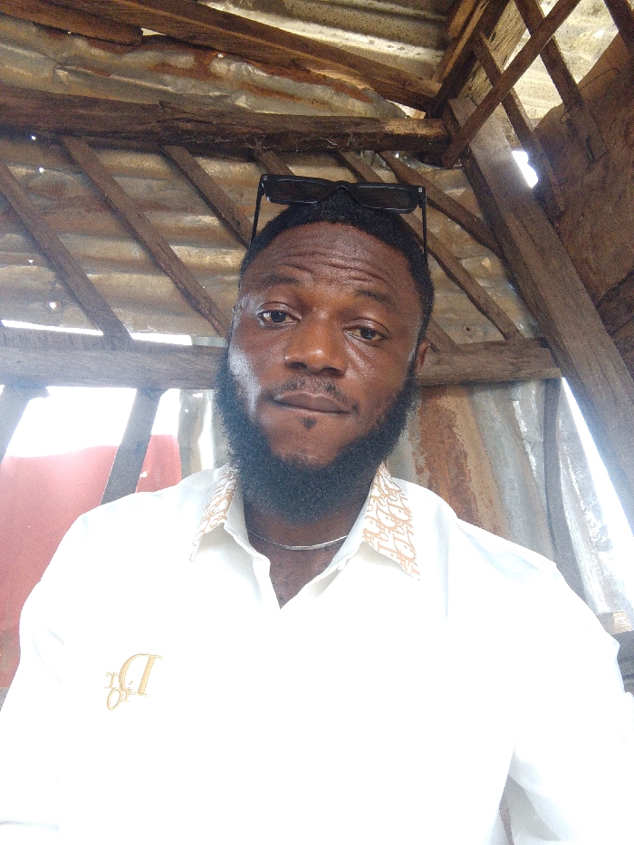 A portrait photograph displays an adult male of dark complexion, featuring a full black beard and short, dark hair, gazing directly at the viewer. Black sunglasses are positioned atop his head. He is attired in a light-colored, likely off-white, collared shirt. The shirt's collar exhibits a light brown or gold repeating pattern, and a stylized 'D' or 'Dior' logo, embroidered in a matching color, is visible on the left chest. A thin, silver-toned chain or necklace is present around his neck. The background reveals an exposed roof structure composed of wooden beams and corrugated metal sheets, some of which show signs of rust or weathering. Gaps between the structural elements allow ambient light to penetrate the space. A reddish-brown surface is partially visible on the left side of the background. The scene is set within a rudimentary shelter or structure, characteristic of informal constructions in areas such as Lokoja, Nigeria; however, the precise location within the city cannot be visually determined from this image alone.