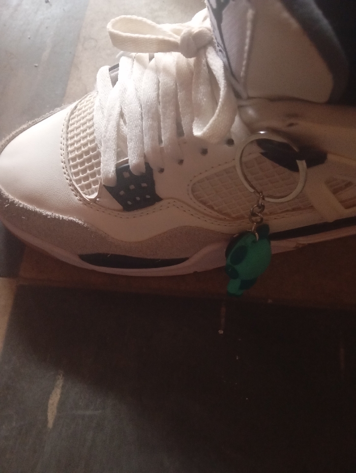 A single athletic shoe, predominantly white or off-white with grey and black accents, is depicted. The shoe features white laces, which are tied. A silver-colored metal keyring is attached to the upper section of the shoe, from which a small, green, multi-faceted charm with black details hangs. The shoe rests on a light brown or tan surface, possibly wood or laminate. The background is dark, likely a shadowed area, with faint lighter streaks visible. The location is Unknown, Unknown.