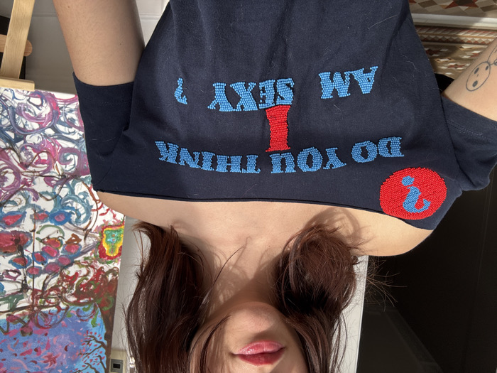 The image displays a person, identified from the upper chest and shoulders, in an indoor setting in Barcelona, Spain. The individual has reddish-brown, shoulder-length hair and red-tinted lips. They are wearing an off-the-shoulder, short-sleeved navy blue top. A red circular beaded patch with a blue beaded question mark is affixed to the left shoulder area of the garment. Across the chest, the phrase "DO YOU THINK I AM SEXY ?" is beaded onto the shirt: "DO YOU THINK" and "AM SEXY ?" are rendered in blue beads, while the letter "I" is in red beads. A minimalist tattoo featuring two stylized faces is visible on the person's left forearm. To the right of the subject, an abstract painting on a wooden easel displays a palette of pink, blue, red, green, and yellow in swirling, organic patterns. The background on the left is a darkened area.