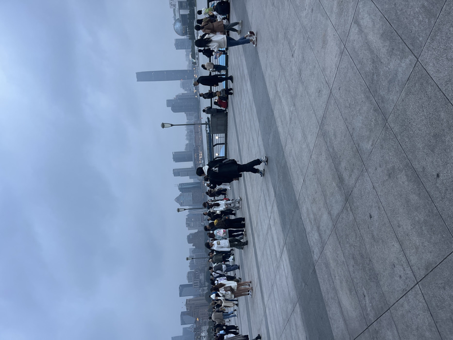 - "The image displays an outdoor scene on a paved waterfront promenade in Shanghai, specifically identified as the Bund, looking across the Huangpu River towards the Pudong financial district skyline" by FM-8oYor1, licensed under CC BY 4.0