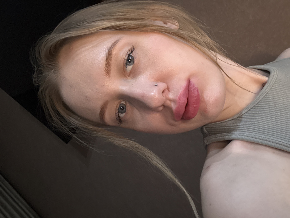 An indoor portrait depicts a young adult female with light-colored, possibly blonde or light brown hair, visible primarily on the sides of her face and around her forehead. Her eyes are blue. She has a small silver stud piercing on the left side of her nose. Her lips are noticeably full and appear to be augmented, with a glossy, pinkish-red color. She wears a ribbed, greenish-grey tank top. The lighting is focused on her face, with the background being uniformly dark, suggesting an indoor setting with low ambient light. The individual is positioned centrally, looking directly towards the viewer, consistent with a self-portrait. There are no other individuals or specific environmental details visible to determine a precise location within Rostov-on-Don, Russia, beyond an indistinct interior.