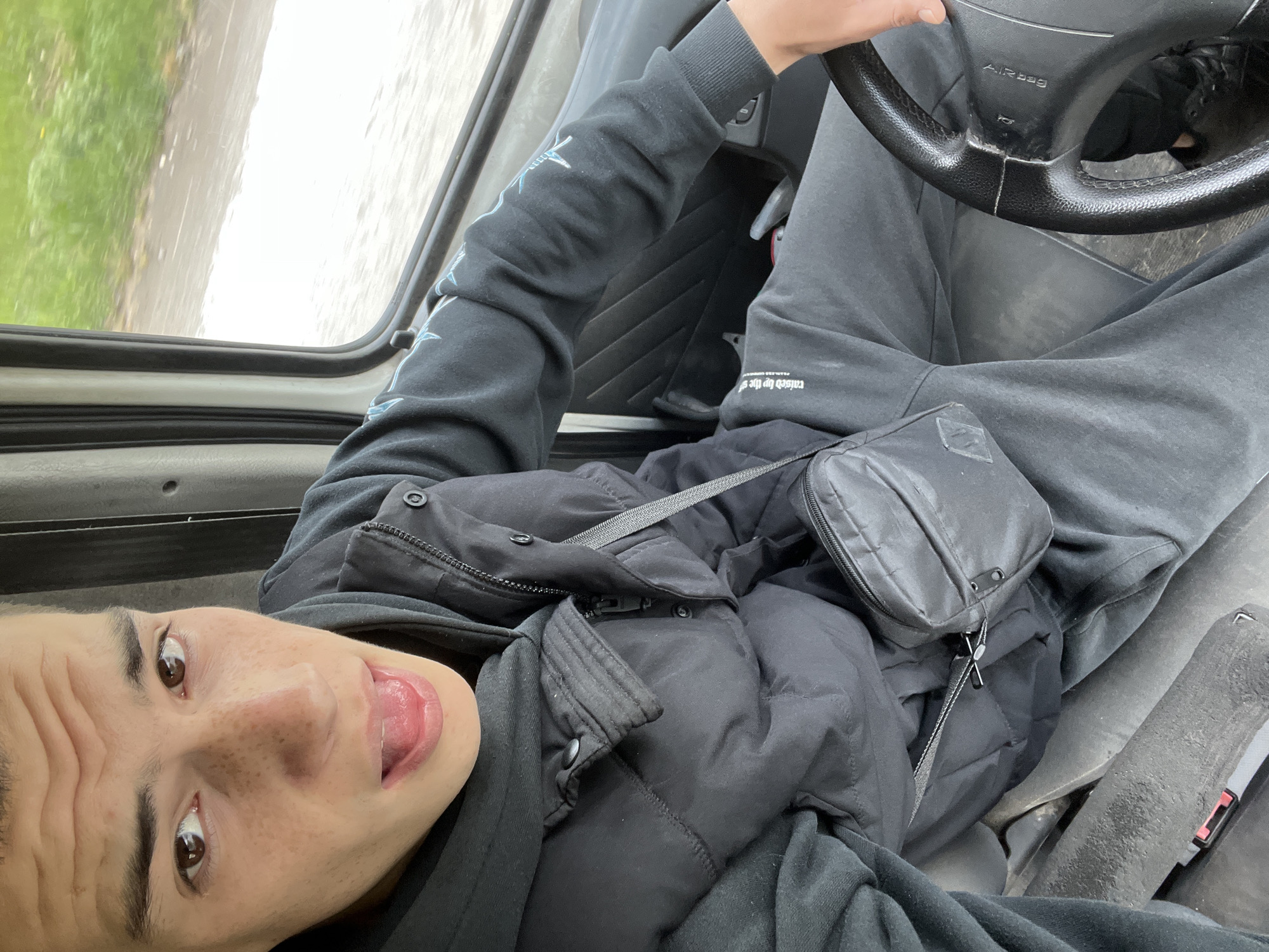A young person is in the driver's seat of a vehicle. The person, positioned at a tilted angle, is wearing a dark-colored hoodie, a black vest, and dark-colored sweatpants, and has a black shoulder bag. The vehicle's steering wheel, visible at the upper right, has "AIRBAG" printed on it. The interior of the car is somewhat worn. Through the car window, a blurry view of what appears to be a road alongside grass is visible. The location of Dabene, Bulgaria is not evident from the visual information.