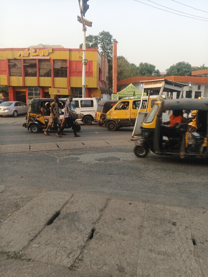- "This image depicts a bustling urban intersection in Onitsha, Nigeria, specifically near a Mr Biggs restaurant and a traffic officer's post" by FM-zA3tn2, licensed under CC BY 4.0