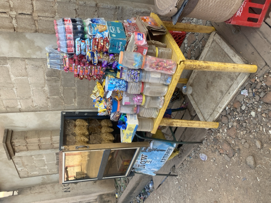 This image depicts a street vendor stall positioned against a weathered concrete block wall in Kakuri Gwari, Nigeria