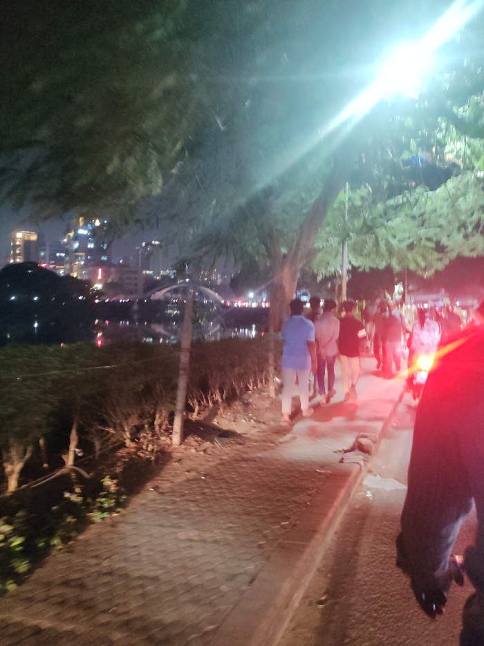 The image depicts a nighttime scene in the Hatirjheel Lake area of Dhaka, Bangladesh. In the foreground, to the immediate lower right, a partial silhouette, possibly of a person or a motorcycle, is visible, accompanied by a prominent red light consistent with a vehicle's taillight. The midground features a paved pedestrian pathway, constructed from interlocking bricks, running diagonally from the mid-left towards the lower right. Approximately seven to ten male individuals are observed walking in single file along this path, moving generally away from the viewer. They are dressed in casual attire, including shirts and pants. A raised curb delineates the pathway's right edge from a darker, likely asphalted, road surface. To the left of the pathway, a continuous line of dense, dark green bushes forms a low barrier. A large tree with a thick trunk and leafy canopy overhangs the pathway from the upper left. The background reveals a body of water, identified as Hatirjheel Lake, beyond the line of bushes. Spanning the water, a distinctive white arch bridge is clearly visible. Further in the distance, an urban skyline is present, characterized by numerous illuminated high-rise buildings displaying various artificial lights (red, blue, white, yellow). These city lights are reflected on the surface of the water. The scene is primarily illuminated by artificial light sources. A very bright, intense light source, likely a streetlamp, positioned in the upper right quadrant, generates a significant glare and lens flare across the image, particularly over the pathway and the walking figures. This light casts shadows, and the overall visibility is moderate due to the strong contrast between brightly lit areas and deep shadows. The environment suggests an urban recreational or public space adjacent to a major waterway.
