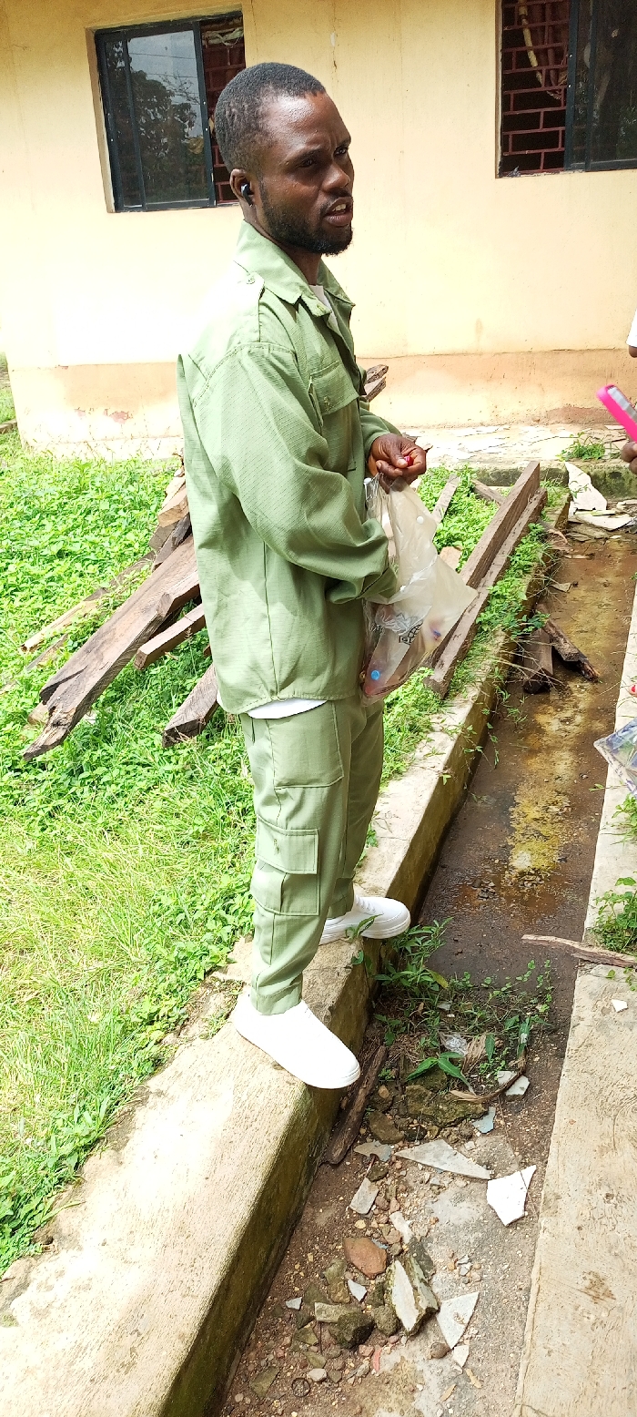 The image portrays a male individual standing outdoors in Aramoko-Ekiti, Nigeria. The subject, a dark-skinned male with a short beard and dark hair, wears a black wireless earbud in his left ear. He is dressed in a light olive green long-sleeved uniform shirt featuring visible pockets and epaulets, paired with matching cargo pants and white low-top sneakers. He stands with his left foot on a concrete curb, looking towards the right side of the frame with his mouth slightly open, suggesting speech or observation. In his right hand, he holds a clear plastic bag containing indistinct items; a small red object is visible between his fingers adjacent to the bag. A partially visible hand holding a pink object, likely a mobile phone, is present on the far right, suggesting another individual is nearby. The background includes a light tan building with two dark-framed windows, the right window exhibiting security bars. To the left of the subject, the ground is covered in green grass and weeds, behind which a stack of weathered wooden planks is visible. To the right of the concrete curb where the subject stands, a concrete-lined ditch contains stagnant water, dirt, scattered fragments of concrete, small rocks, and sparse green vegetation. The scene is illuminated by daylight.