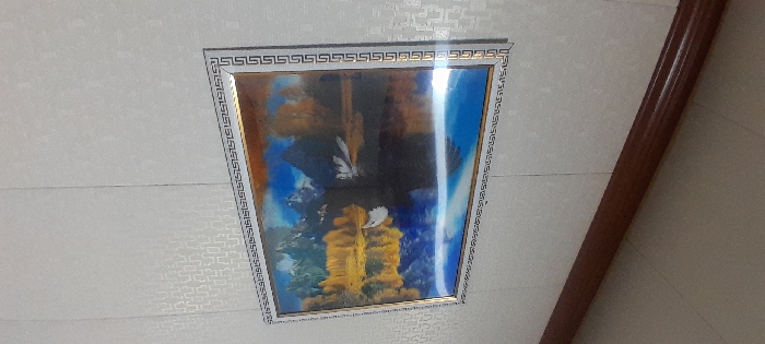 The image depicts a framed artwork mounted on a textured wall in an interior setting within Chinabad, Uzbekistan