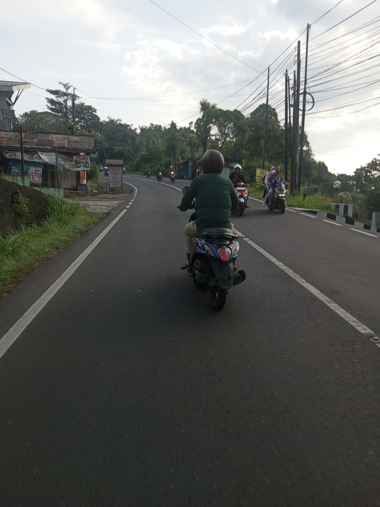 A road scene in Mya Sit Kaing Ywar Thit, Myanmar features multiple individuals riding motorcycles. The perspective is from a rider following a motorcycle with a single rider wearing a helmet and green jacket. Further ahead, two more motorcycles are visible, one with a single rider and the other with three people on it. The road is paved and has white lines marking the lanes. Buildings and vegetation border the road, and power lines are overhead. The sky is overcast.