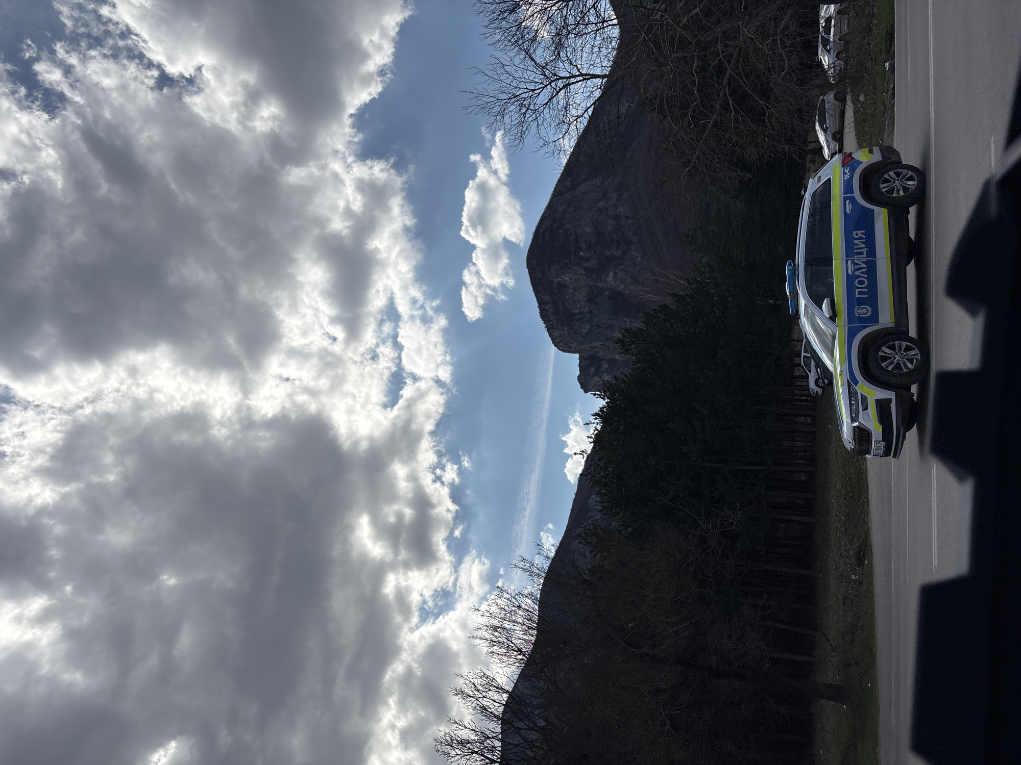 An outdoor, vertical, mid-day photograph captures a section of a paved two-lane road in a mountainous, forested environment within the Vrachanski Balkan Natural Park near Vratsa, Bulgaria. The lower foreground is obscured by a dark, out-of-focus structure. A white and blue Bulgarian police Skoda Kodiaq SUV is situated on the right lane of the road, oriented towards the left, displaying "ПОЛИЦИЯ" in blue Cyrillic text, blue and yellow reflective stripes, a roof-mounted blue light bar, the side number "06-42", and a visible front license plate "BP 2993 CP". To the right of the police vehicle, multiple light-colored civilian cars are parked on a dirt incline adjacent to the road. A dense line of dark evergreen trees borders the road on the left, with additional bare deciduous trees scattered throughout the scene. The background is dominated by a range of dark, rugged mountains and rocky peaks, consistent with the geological features of the Vratsata Gorge. The sky above is partially covered by large, bright white and gray cumulus clouds, with intermittent patches of clear blue sky visible. No individuals are depicted.