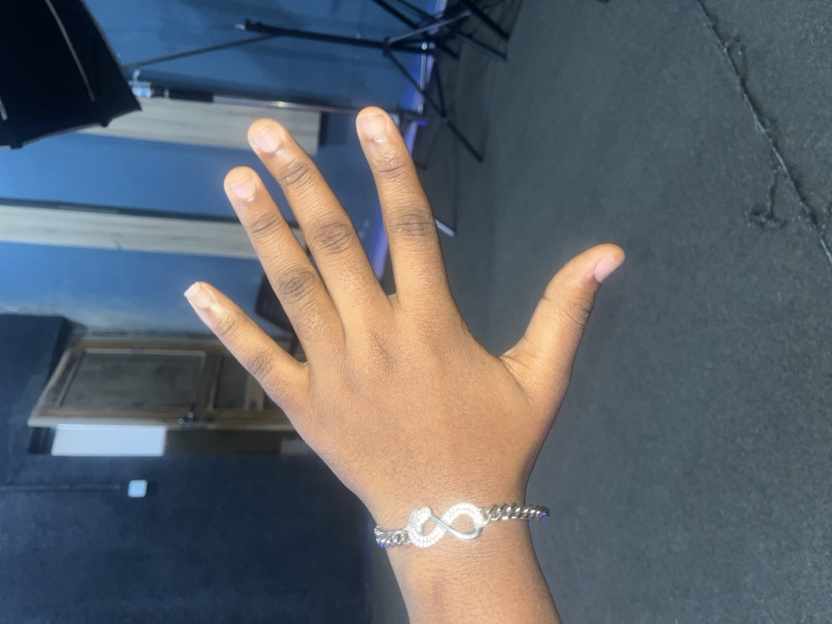 The image displays a human left hand, palm down and fingers splayed, oriented with the fingertips towards the top right. The hand exhibits a medium-brown skin tone with naturally trimmed, unpolished fingernails. A silver-colored curb chain bracelet is worn on the wrist, featuring a central infinity symbol encrusted with small clear stones. One end of the infinity symbol is fashioned into a stylized snake head. The background on the left side reveals a dark wall with a light-colored electrical switch or outlet. A partially open wooden door with vertical panels is visible further back. The background on the right features a blue wall with vertical light-colored architectural elements or panels. Studio lighting equipment, including a black softbox mounted on a tripod stand, is present on the right, with another tripod stand partially visible behind it. The floor is dark gray or black, possibly concrete, with a noticeable seam or crack running horizontally in the lower frame. The scene is illuminated by artificial light. This indoor setting is located in Jos, Nigeria.