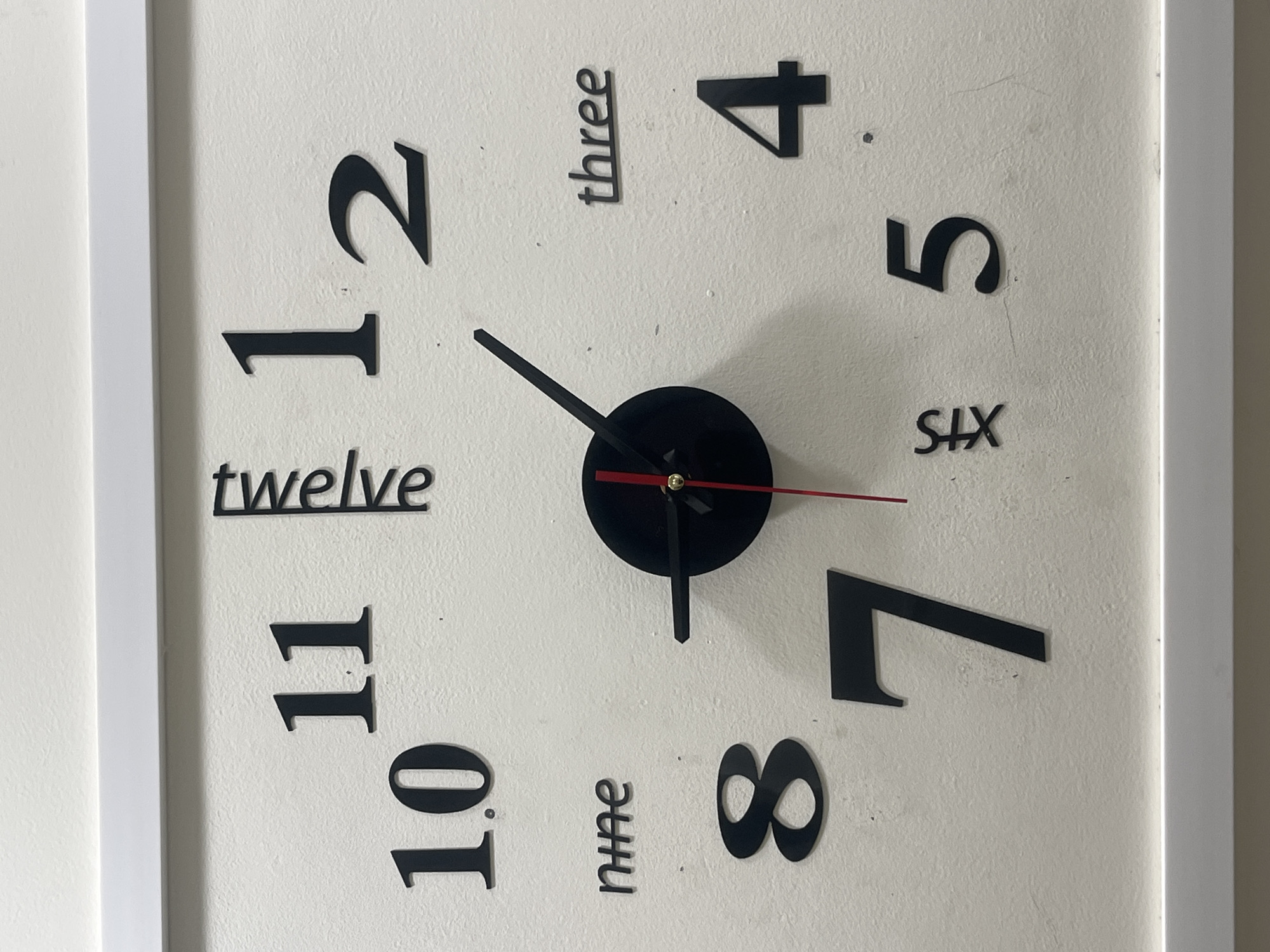 rectangular white clock with black hour and minute markings