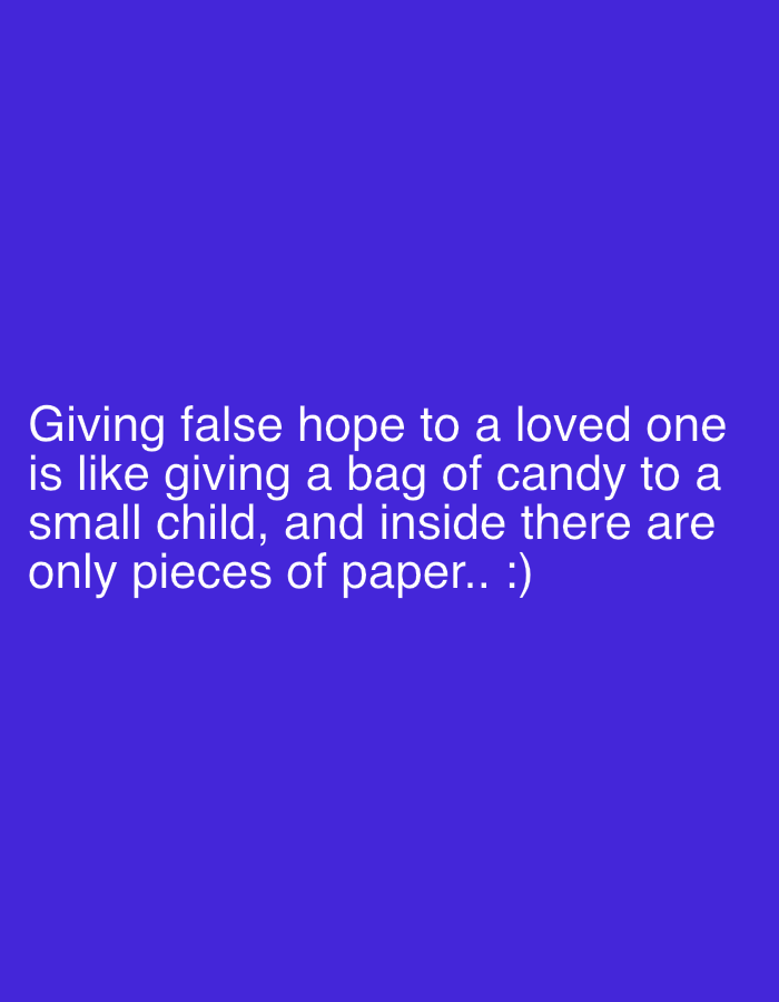 The image displays white sans-serif text on a solid royal blue background. The text reads: "Giving false hope to a loved one is like giving a bag of candy to a small child, and inside there are only pieces of paper.. :)". No individuals, objects, actions, or specific environmental features are visually depicted within this graphic. This image is associated with the city of Yablanitsa, Bulgaria.