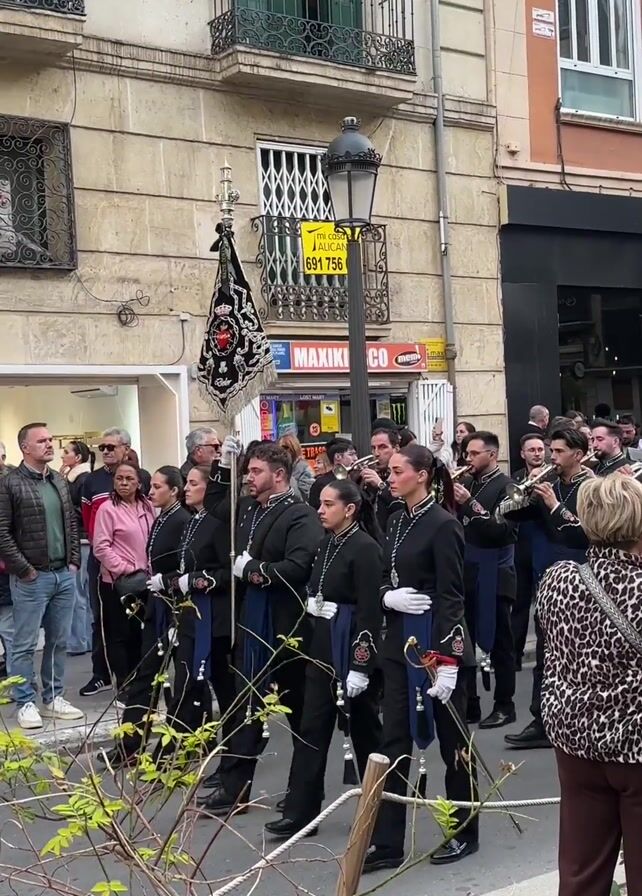 A procession of musicians in uniform moves along a city street. They are dressed in dark suits with blue accents and white gloves. They play brass instruments, mainly trumpets. A black flag with ornamental fringe is carried at the front. The musicians march between buildings, and people stand on the sidewalks to watch. Some people are taking photos or videos. The buildings are various colors, and some have balconies. There are shops and other establishments along the street. A small bush is visible in the foreground.