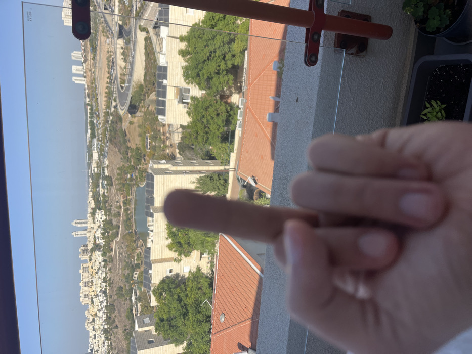 A blurred, light-skinned human hand in the immediate foreground displays a middle finger gesture, directed outwards from the vantage point of a balcony in Modiin-Maccabim-Reut, Israel