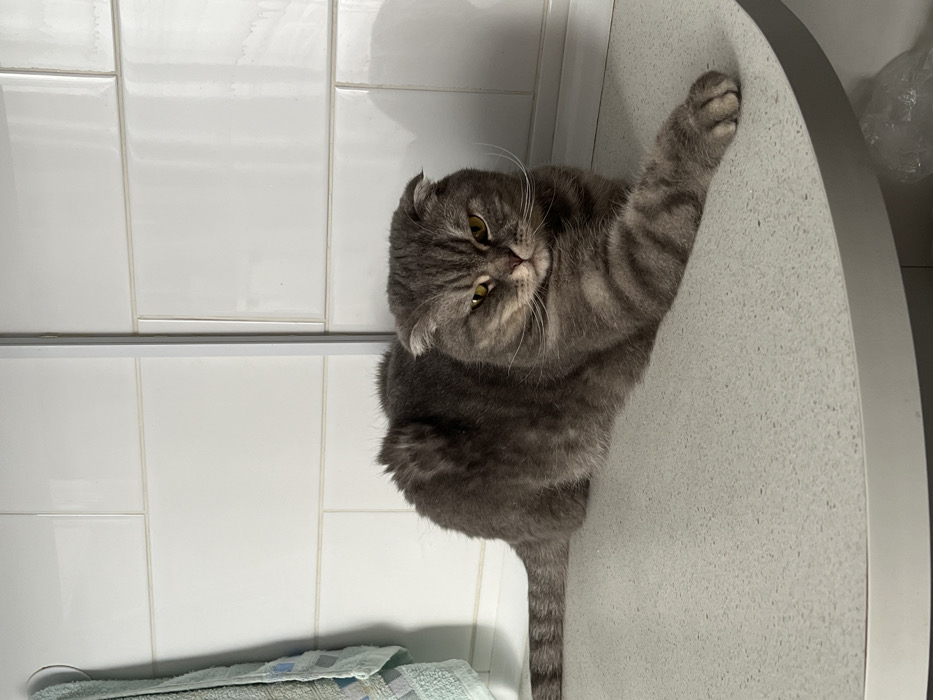 A gray tabby Scottish Fold cat rests on a speckled gray surface, possibly a countertop. The cat's front paw is extended, seemingly touching the surface. The cat is looking at the camera with yellow eyes. Behind the cat are white tiled walls. A folded blue and green towel is visible in the lower left corner.
