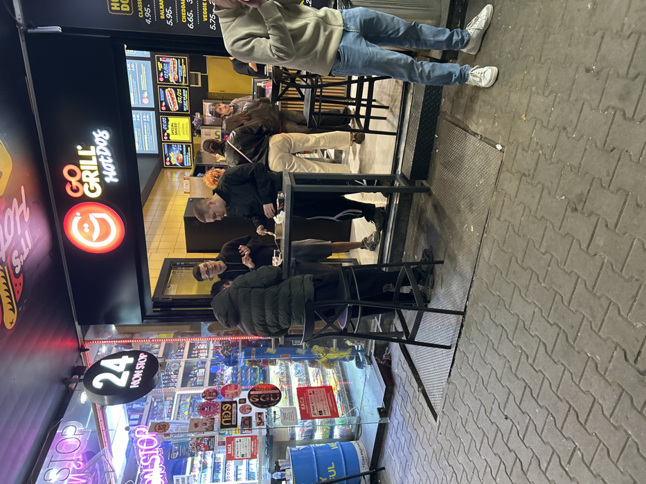 The image depicts an evening street scene at the "GO GRILL Hot Dog" establishment, located at ul