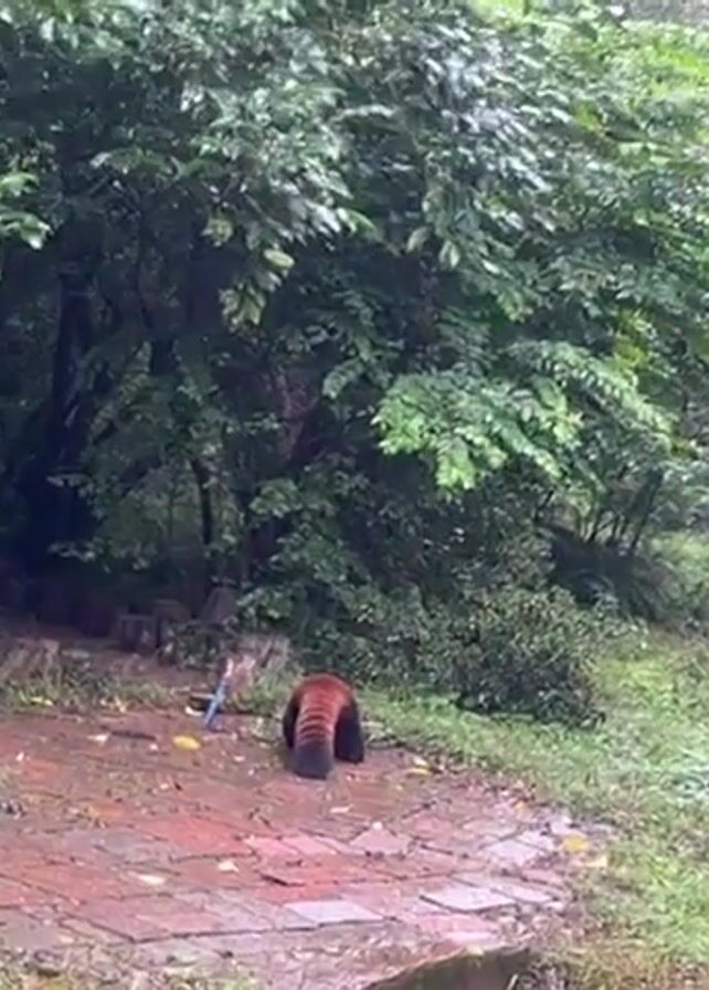 The camera is still and angled down towards a red panda, which is standing in an outdoor enclosure with lush greenery in the background. The red panda is facing away from the camera, its bushy tail clearly visible. The ground is a red-brick path with some wet spots on it. There are trees and various green plants behind the red panda, creating a dense background of foliage. The environment suggests a zoo or wildlife park. A voice is heard saying something in the background.