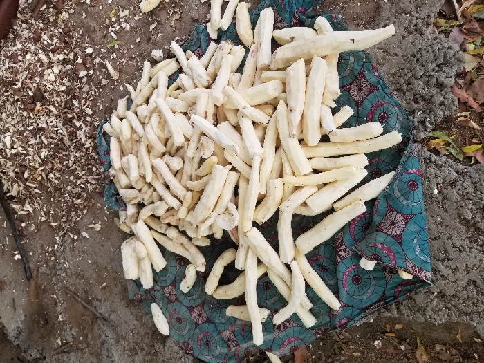 - "large pile of peeled, white cassava sticks lying on a teal and pink patterned cloth" by FM-ycer72, licensed under CC BY 4.0