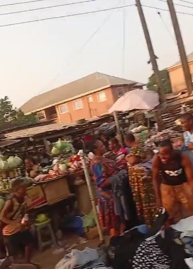 The video depicts a bustling outdoor market with numerous people and stalls. The market appears to be in a residential area with buildings visible in the background. Some people are standing near stalls, examining or buying items, while others are walking through the crowded space. Stalls are laden with various goods, including vegetables, clothes, and other merchandise. An electrical pole stands near the center of the view, with power lines running overhead. The overall atmosphere is lively and active.