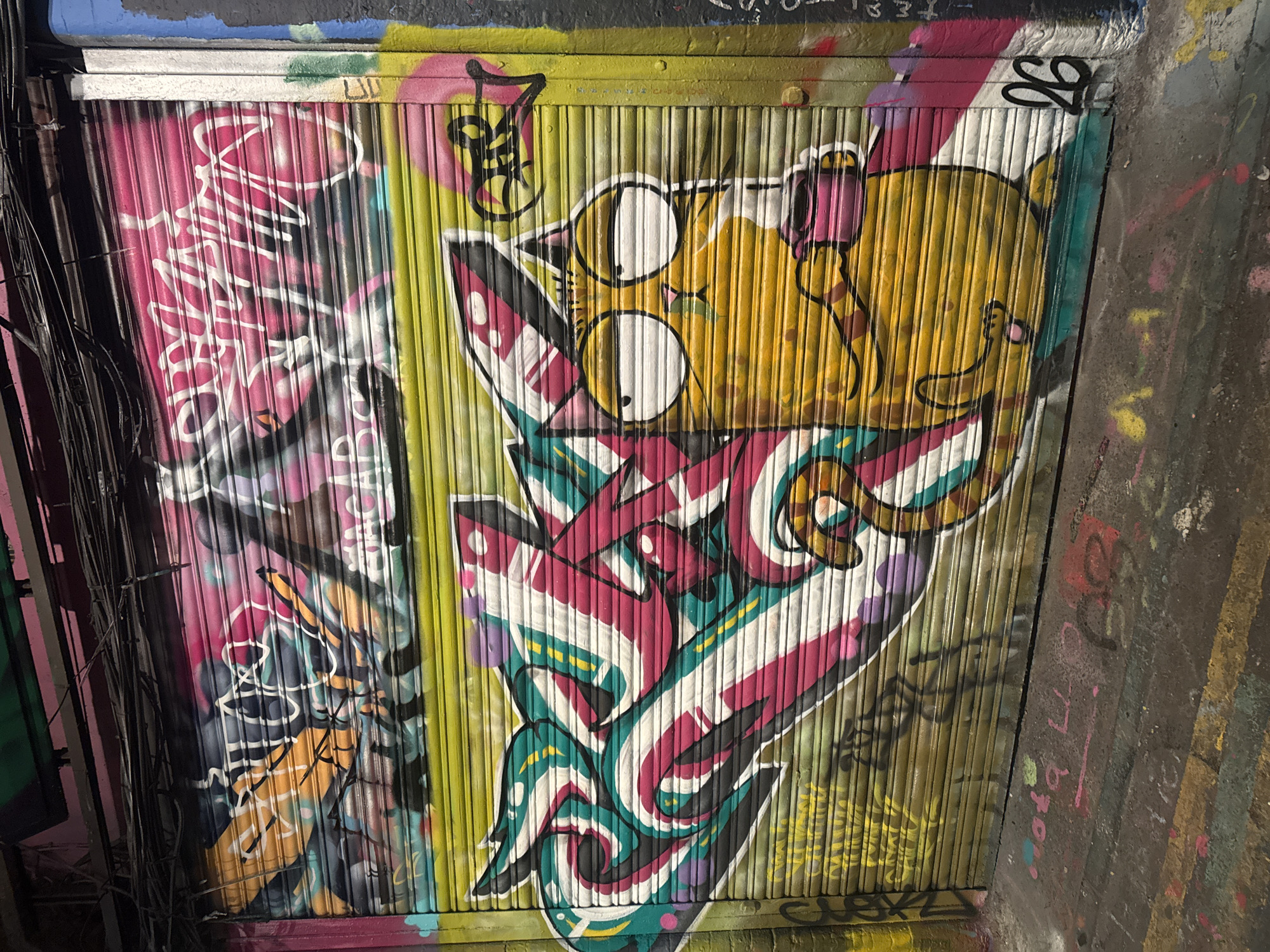The image captures graffiti art on corrugated metal panels, possibly under a bridge or in a derelict urban space. The dominant artwork features a character with large, round eyes and a yellow body, reminiscent of a cartoon style. This character is intertwined with abstract shapes and lines in colors like pink, teal, white, and black. To the left, another section of graffiti presents a more chaotic mix of colors and abstract forms. The metal panels themselves have vertical ribbing. The surrounding environment shows signs of age and disrepair, with stains and discolorations on the surface. Cables or wires are visible on the left side of the frame, possibly related to utilities or infrastructure. The image is undated and lacks further context regarding a specific location within London, United Kingdom.