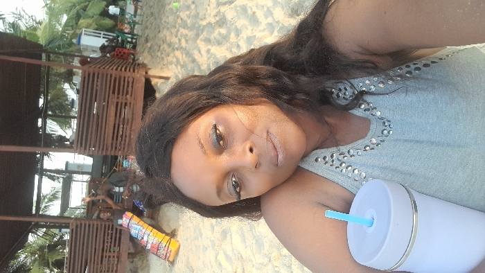 A woman poses for a selfie on a sandy beach. She holds a white tumbler with a blue straw. She wears a light gray tank top adorned with decorative studs. Behind her is a wooden shaded structure with people and palm trees visible in the background. The sunlight casts a warm glow on her face and surroundings.
