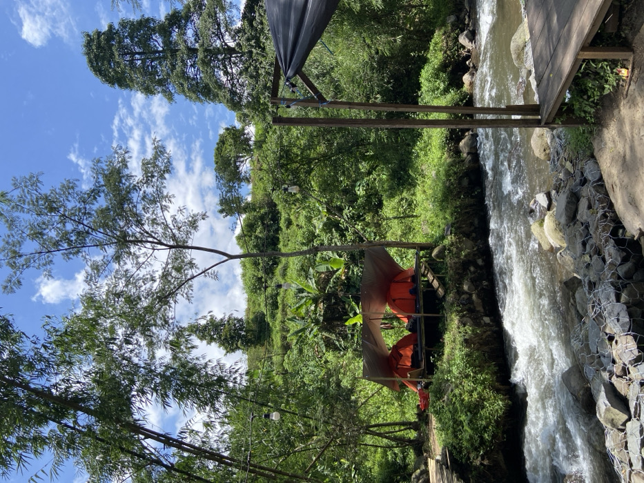 A vibrant outdoor scene featuring a flowing river framed by lush greenery and rocky edges. An open-sided structure with a dark canvas roof stands beside the river. Tents are visible amidst the verdant foliage. Tall trees reach towards a blue sky dotted with clouds. The scene blends nature's beauty with outdoor accommodation.
