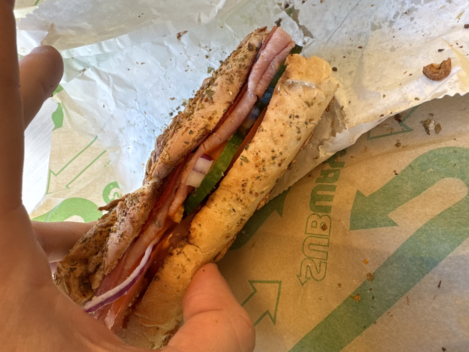 - "A human hand, light-skinned, grips a partially unwrapped sub-style sandwich" by FM-m4g533, licensed under CC BY 4.0