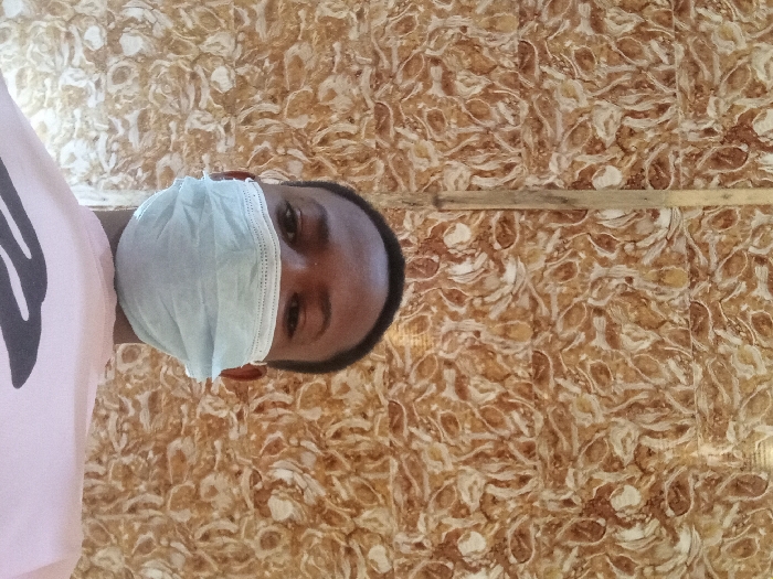 A person wearing a light blue surgical mask faces the viewer. The individual has dark skin and dark hair. They wear a light pink shirt with a dark graphic on the shoulder. The background is a textured wall with a repeating pattern of beige and brown ovals and swirls, resembling an abstract floral design. A thin, light brown wooden strip runs horizontally across the upper right portion of the wall. The image is slightly rotated, giving a tilted perspective.