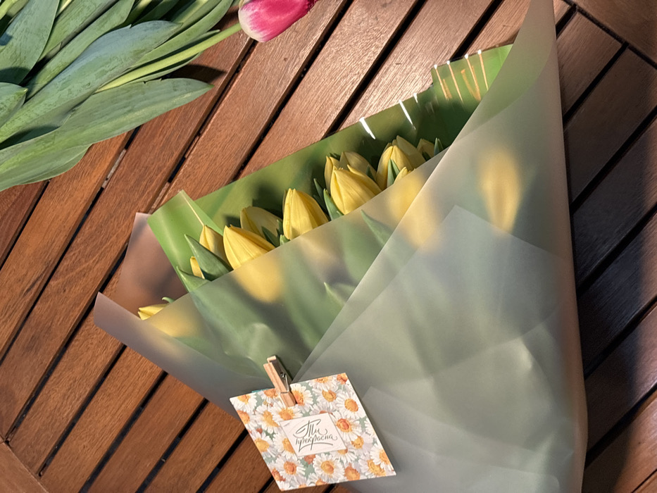 An overhead photograph captures a floral arrangement situated on a slatted wooden surface in Slavyansk-na-Kubani, Russia. A central bouquet of numerous closed yellow tulips, enclosed within green and translucent light-green wrapping paper, dominates the left and central frame. A small, square greeting card, patterned with white and yellow daisies and bearing the partially visible Cyrillic inscription "Ты прекрасна," is secured to the outer wrapping with a miniature wooden clothespin. To the upper right of the frame, a distinct cluster of loose green tulip stems and leaves is visible, featuring a solitary pink tulip bud with a white-edged tip. The underlying surface consists of reddish-brown wooden slats, exhibiting distinct grain and receiving natural, diffused illumination.