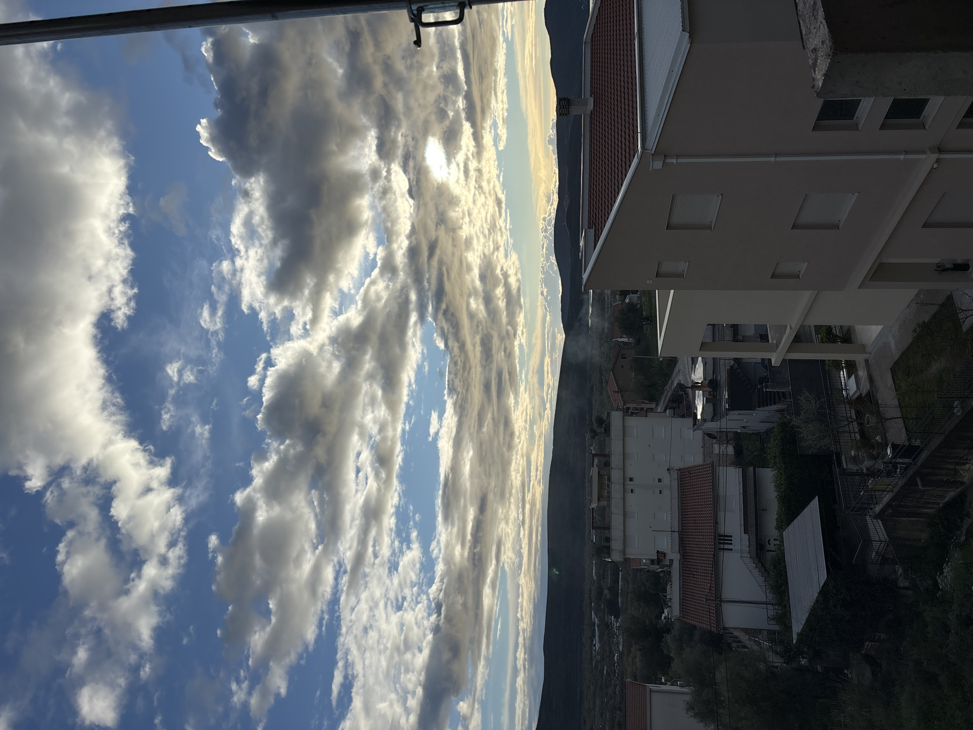 The image depicts an elevated view of a residential area within Kavač, Montenegro, under a partially cloudy sky. The sky, occupying approximately the upper two-fifths of the frame, features a mix of blue patches and numerous cumulus and stratocumulus clouds, illuminated by sunlight breaking through in the upper right quadrant. In the immediate foreground on the right, a dark concrete wall or pillar is visible, alongside a vertical grey metal pole with a bracket attached. Adjacent to this, a modern, multi-story residential building with a light beige/cream-colored facade and a sloping red tile roof with white gutters dominates the right midground. This building features multiple windows with white roller shutters, some closed. To the left and further into the midground, several other residential structures are visible. A prominent white, multi-story building with a flat roof is situated towards the center, displaying multiple windows. Below it, a white house with a terracotta tile roof and an external staircase leading to an upper entrance is partially obscured by dark green vegetation. A separate, lower structure with a grey corrugated metal roof, possibly a carport, is visible beneath this house. Extensive dark green foliage, including trees and dense bushes, is interspersed throughout the residential area. In the background, a wide valley stretches towards a range of dark, forested mountains that form the horizon. Within the valley on the left side, a distinct plume of white smoke rises vertically, indicating an active combustion source. No individuals, vehicles, or discernible active interactions are present in the scene. The overall lighting suggests either early morning or late afternoon.