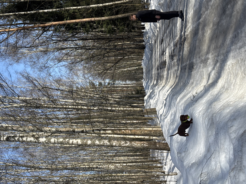 The image displays an outdoor scene in a forested area of Zelenogradskiy, Russia, under a clear blue sky. A dirt road, partially covered in slush and puddles from melting snow, recedes into the distance, flanked by substantial snowdrifts on either side. The forest consists predominantly of tall, slender birch trees with white bark, largely devoid of leaves, indicative of late winter or early spring. Some darker evergreen trees are visible on the far right. An adult male with light-brown hair and a beard stands upright on the right side of the road, wearing dark clothing, and facing slightly left. On the snowdrift to the left of the road, a brown dachshund dog holds a light-green ball in its mouth, appearing in motion with its tail raised. A wooden post is partially visible in the snow on the left, behind the dog.