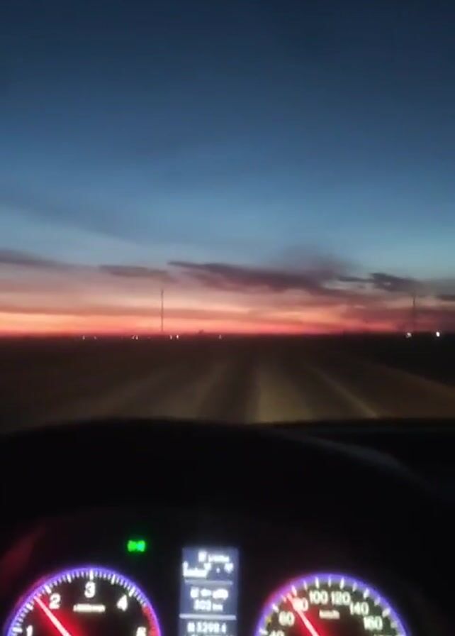 The view from inside a car driving on a road at dusk. The speedometer is visible, showing the car traveling around 80 km/h. The dashboard lights are illuminated in blue and white. Through the windshield, the road stretches ahead towards the horizon where a vibrant sunset paints the sky with shades of pink, orange, and blue. The landscape appears flat. Electrical poles line the sides of the road in the distance.