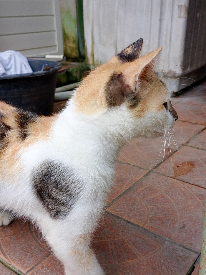 - "A calico domestic cat is depicted in profile, facing right, standing on a reddish-brown tiled surface in Gadingrejo, Indonesia" by FM-18r9D3, licensed under CC BY 4.0