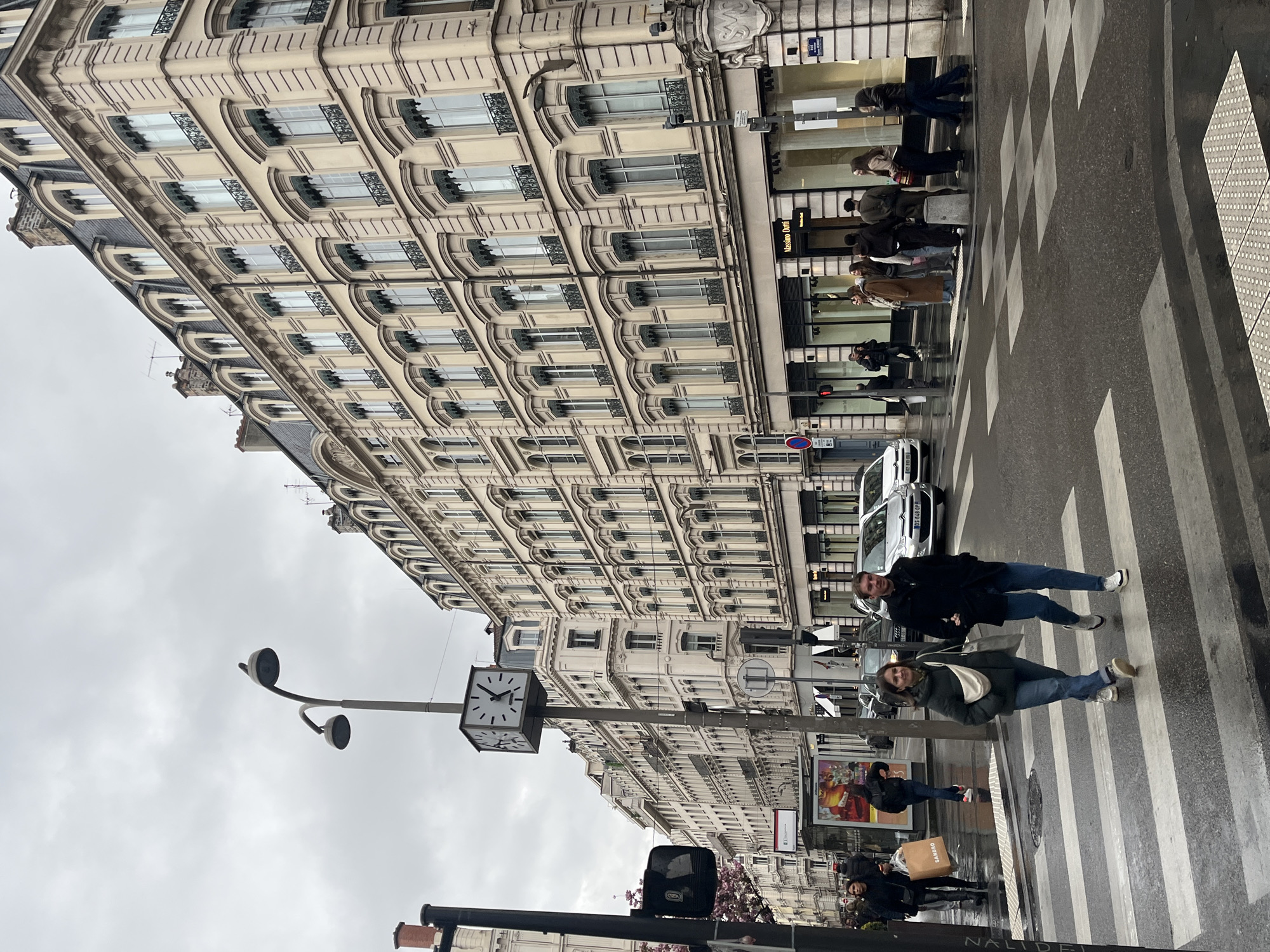 The image depicts a street scene in Lyon, France, on an overcast day. The focus is on a crosswalk where several pedestrians are present. Two people, a man and a woman, are walking across the crosswalk towards the viewer. A third person is crossing with a shopping bag. Other people are waiting on the sidewalk or walking nearby. On one side of the street, a large, ornate building with multiple windows dominates the background. The building appears to be a commercial structure, with shops or businesses visible on the ground floor. Streetlights, traffic signals, and street signs are positioned along the edge of the sidewalk. A clock mounted on a pole displays the time. A few cars are parked or driving on the street.