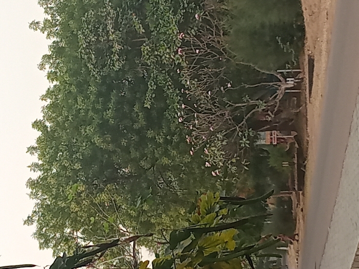 A lush green tree dominates the left, contrasting with a thinner tree featuring pinkish-white blossoms to the right. These trees are near a roadside, with some signs and structures visible partially obscured by the greenery. The foreground reveals more foliage, and the overall scene is shot at an angle, slightly distorted and off-center. The sky is overcast, contributing to a muted color palette.
