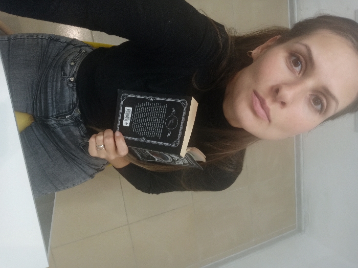 A woman is depicted indoors, within a room located in Irkutsk, Russia. She has long brown hair, dark eyes, and a neutral expression while looking directly at the camera. She wears a black long-sleeved turtleneck shirt and grey skinny jeans. A small gold hoop earring is visible on her left ear, and a silver-colored ring adorns her left ring finger. In her left hand, she holds an open book with a dark, decorative cover, light-colored text, and visible pages. Her posture indicates she is kneeling or sitting on a low, partially visible yellow object. A white surface, possibly a table or counter, occupies the lower foreground, obscuring parts of her lower legs. The environment features light-colored square tiled flooring with dark grout lines and plain, light-colored walls.