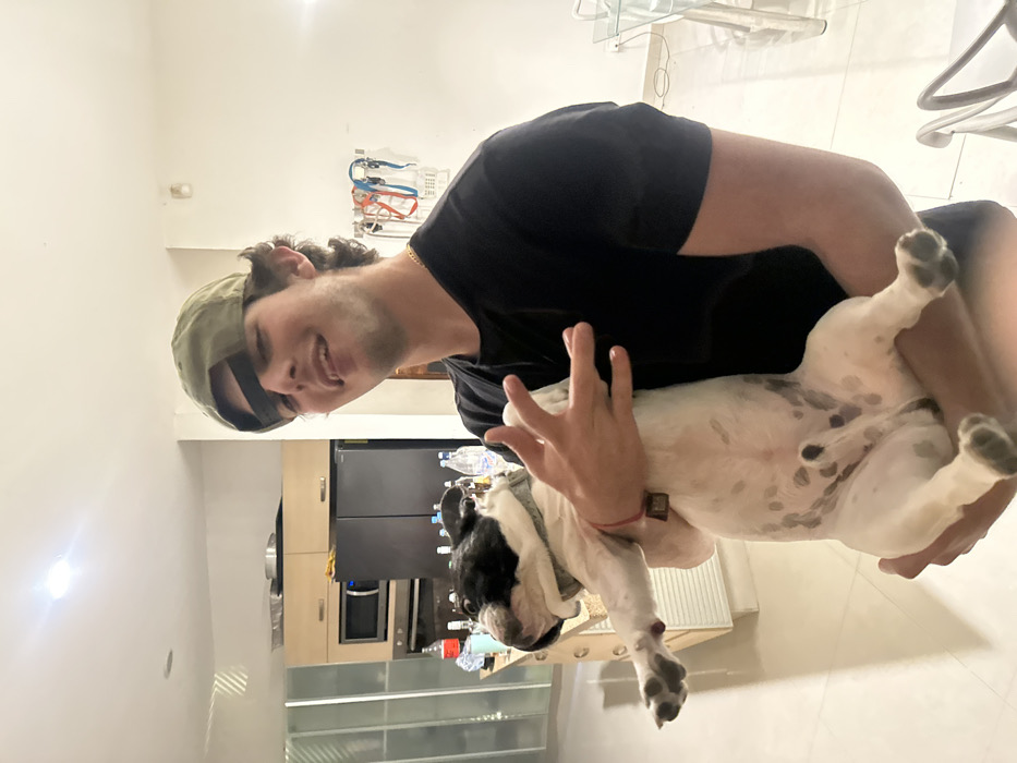- "A man wearing a black shirt and olive-green baseball cap holds a French bulldog upside down" by FM-jryY43, licensed under CC BY 4.0