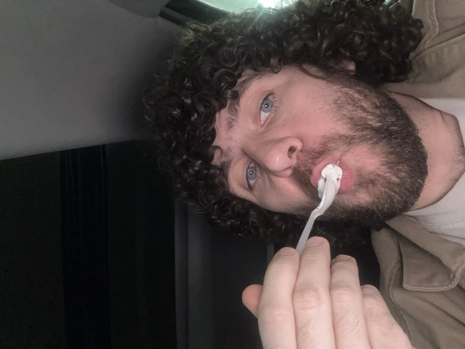 A male individual with dark, curly hair, a beard, and blue eyes is depicted from the chest up, situated inside a vehicle within the city of Pushkino, Russia. He wears a light brown jacket over a lighter-colored shirt. The individual is in the process of ingesting a white substance, consistent with ice cream containing dark fragments, from a white plastic spoon held to his mouth. The immediate environment is dimly lit and consists of the interior of a vehicle, with the dark headliner visible in the upper background.