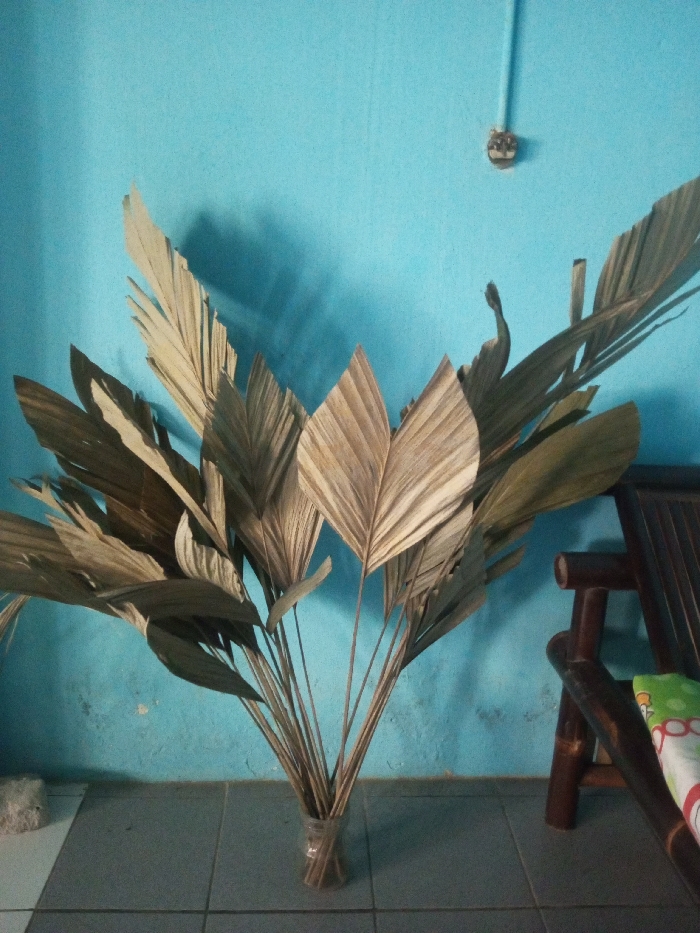 - "A collection of dried palm fronds, varying in shades of light brown and beige, is arranged vertically in a clear plastic container placed on a tiled floor" by FM-3mobU2, licensed under CC BY 4.0