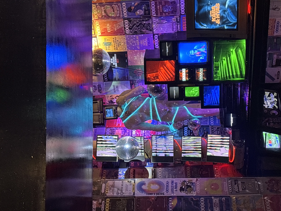 The image showcases a wall art installation. It comprises a collage of what appears to be vinyl record sleeves and interspersed old television sets displaying various content, some with solid colors. A nude statue with neon-blue tubing wrapped around it is prominently displayed in the center, with disco balls strategically placed around it. The wall is also illuminated with colorful lighting effects, giving the scene a dynamic and artistic aesthetic.