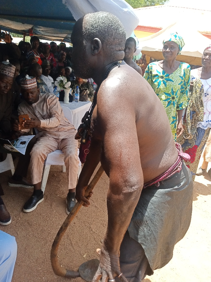 man standing in a courtyard in Zum, Nigeria, holding a long wooden implement in his hands. He is wearing a black skirt and a red and white belt with straps over his shoulders. The man's back is to the camera. The man is looking to his left, where several people are sitting on white chairs under a blue canopy. The group of people to the left of the man is mostly men, wearing traditional clothing, and one woman in a hijab. Behind the man, to the right of the image, there are other women standing, wearing colorful clothing and headscarves. There is a large blue canopy behind the woman, and there appears to be some type of building in the background. The ground is dusty and dry. The image is likely taken during a public ceremony.