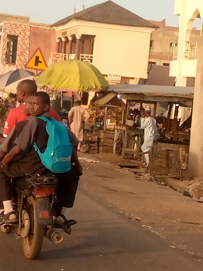 Two people are riding a motorcycle on a road lined with buildings and market stalls. A young boy with a blue UNICEF backpack sits behind the driver. A road sign stands near a yellow umbrella over a market stall. Across the road, more stalls are visible, and a man in a white robe stands near them. The overall scene suggests a busy street in a developing country.