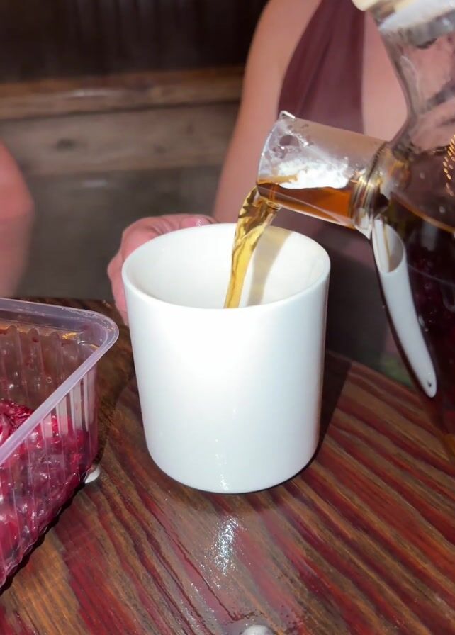 woman pouring a drink into a white cup from a glass teapot. She is sitting at a wooden table next to a plastic container of red berries. In the background, a person is soaking in a hot tub. Steam rises in the air.