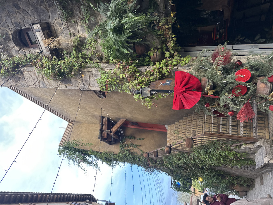 An old building facade is adorned with lush greenery and holiday decorations. A large red bow is prominently displayed near a vintage lamppost, adjacent to a staircase. Garlands of pine needles, red ornaments, and decorative buttons add to the festive atmosphere. The stone building is partially covered in climbing plants, complementing the hanging pots and ferns. String lights are suspended overhead, casting a soft glow on the scene below.