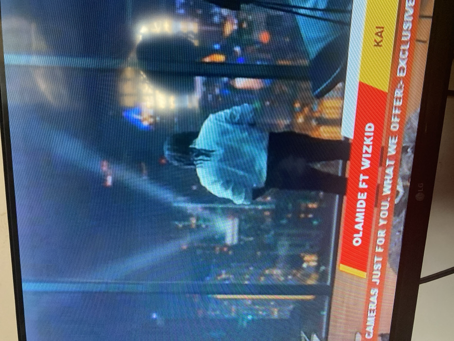 The image displays a television screen broadcasting a scene of an individual observing a nocturnal urban cityscape. A male individual stands with his back to the viewer, positioned before a large window overlooking a city illuminated by numerous lights from buildings against a dark sky. He wears a light-colored, long-sleeved collared shirt and dark trousers. His dark hair is styled in dreadlocks or braids, gathered at the back. To his right, partially visible, is dark studio equipment, possibly a light stand. A red and yellow horizontal graphic appears at the bottom of the television screen. The red segment features the text "OLAMIDE FT WIZKID", while the yellow segment on the right displays "KAI". Below this graphic, a scrolling white text message is partially visible, reading "CAMERAS JUST FOR YOU. WHAT WE OFFER:- EXCLUSIVE". The environment depicts an urban high-rise setting at night.