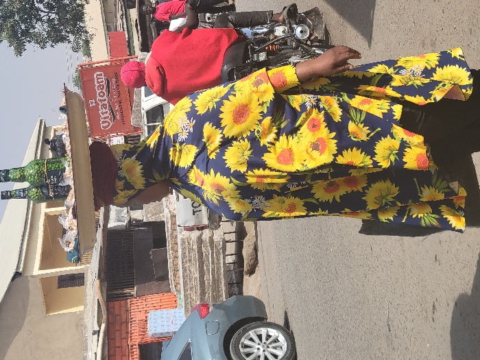 The image displays a street scene in Suleja, Nigeria. A person, viewed from behind and the right, walks on an asphalt road, balancing a rectangular tray on their head. This individual is clad in a long, loose-fitting garment featuring a dark blue background with a prominent yellow sunflower pattern, and a dark red head covering. The tray carries two large green bottles, likely plastic, filled with small green objects, several small clear plastic bags containing food items, and a small black plastic bag. To the left, the rear wheel and a portion of a light blue or silver car are visible. In the mid-ground, a white Toyota pickup truck is partially visible. Further in the background, to the right, a person wearing a red hooded garment is seated on a dark-colored motorcycle, facing away from the viewer. Behind this motorcycle, a large red sign with "Vitafoam" in white lettering is prominent. Various light-colored buildings, appearing to be a mix of residential and commercial structures, line the street under daylight conditions.