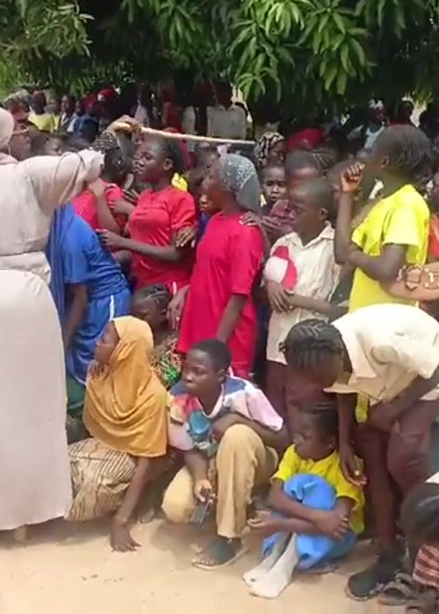 A large group of people, mainly children, are gathered outdoors. A woman in a long beige dress and head covering stands facing the group, holding a stick in her right hand and gesturing with her left. Many of the children are seated on the ground, while others stand behind them. A man in a blue and white striped shirt stands at the edge of the group on the right. The setting appears to be a dirt or sandy area with trees in the background. There are various colors of clothing worn by the children, including yellow, red, blue, and green.