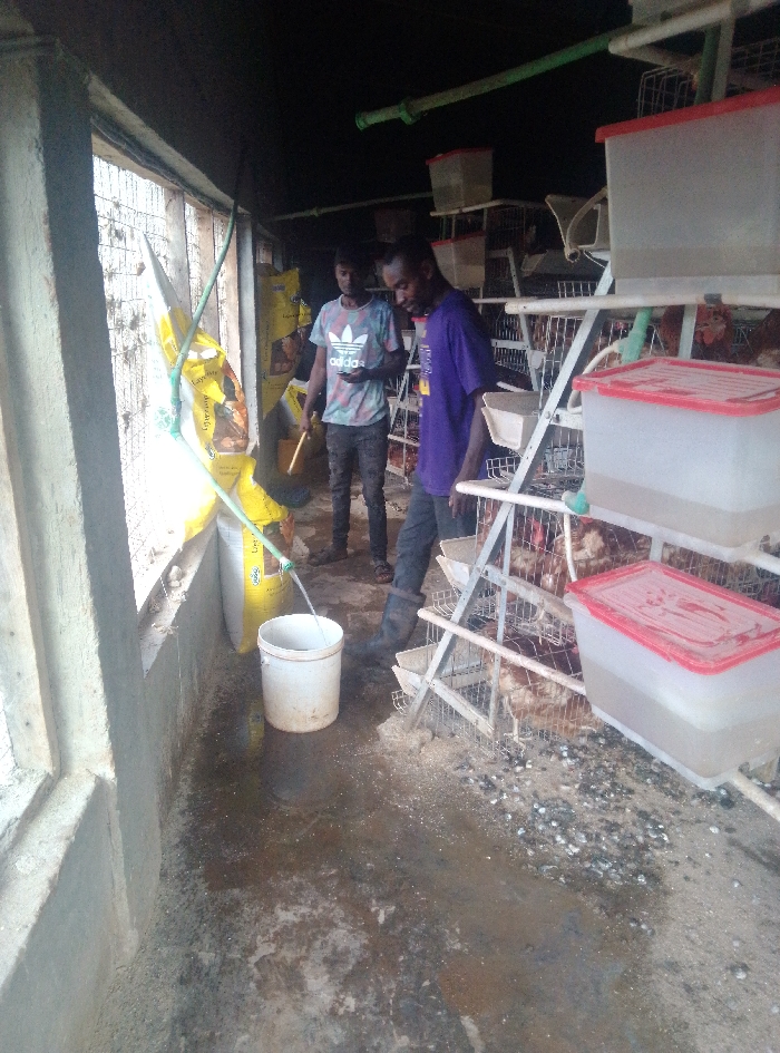 Two men are inside a poultry farm. One, wearing a purple shirt and black boots, stands near rows of caged chickens with red-lidded water containers. The other, in a patterned t-shirt, holds a yellow object. A hose fills a white bucket, resting on a soiled floor with scattered debris. Bags of feed lean against a wall near barred windows, providing the only light in the otherwise dark room.