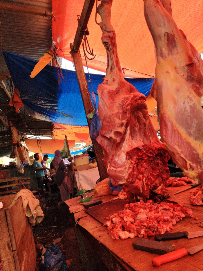 - "At a market, a butcher shop displays large cuts of meat hanging from hooks under a makeshift orange and blue tarp roof" by FM-bZrK33, licensed under CC BY 4.0